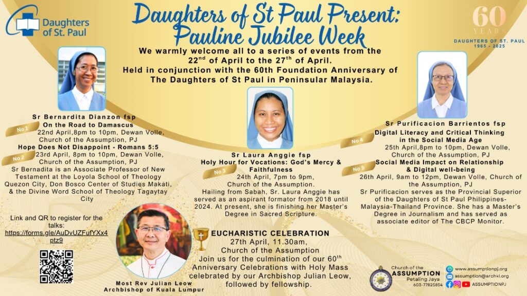 PETALING JAYA – In conjunction with the 60th foundation anniversary of the Daughters of St Paul in Peninsular Malaysia, a Pauline Jubilee Week featuring talks and Holy Hour was organised April 22-26, 2025 at the Assumption Parish Hall here.