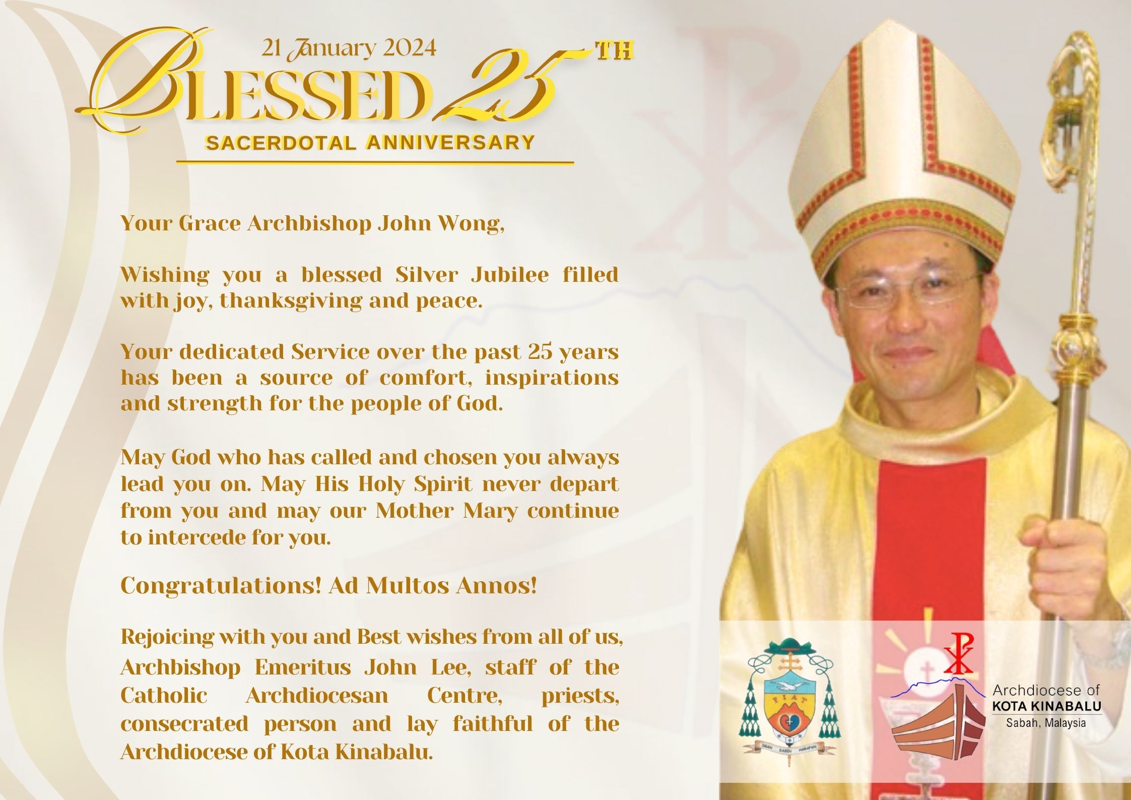 Motto = The prelate’s motto is based on the three theological virtues of Christian life – faith (iman), love (kasih) and hope (harapan). It is a reminder to him to see that the faithful would live, grow and persevere in faith to the end, nourishing it with the word of God, working through charity and abounding in hope, rooted in the sacraments and rich traditions of the Catholic Church and at the same time, fulfilling the Mission and Vision of the Archdiocese.